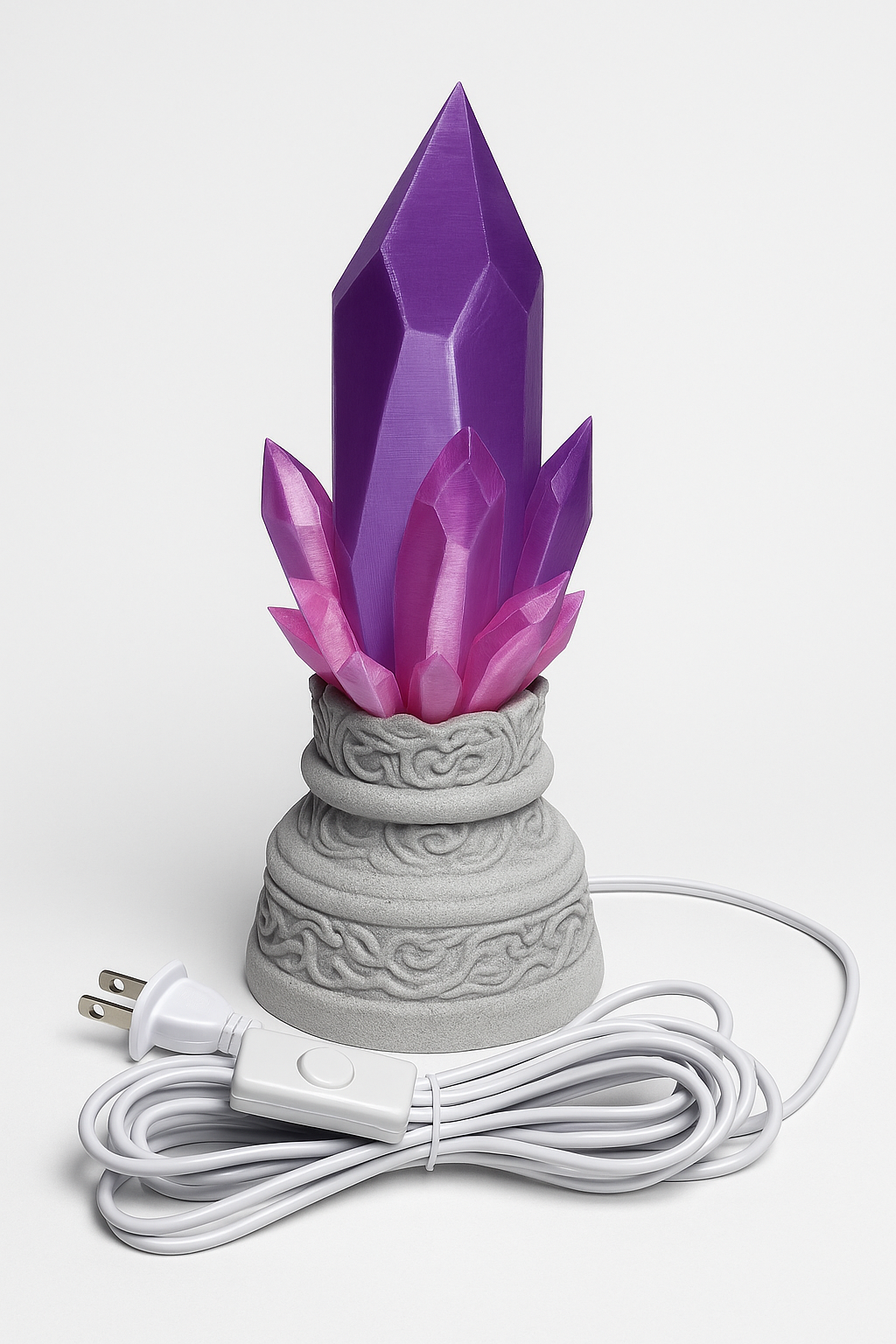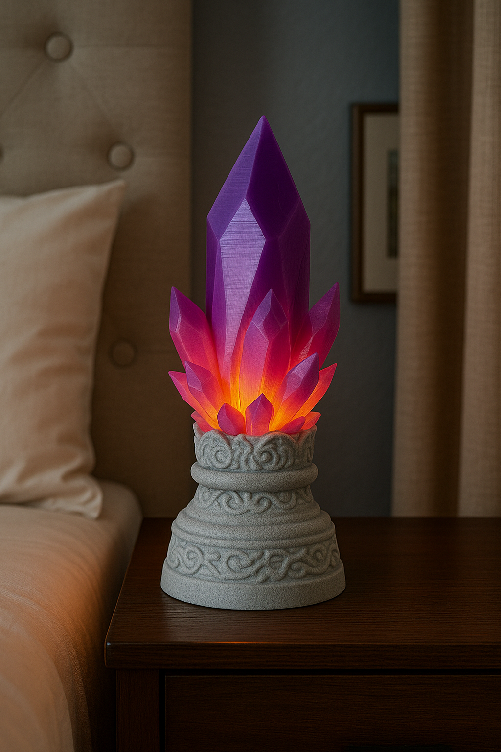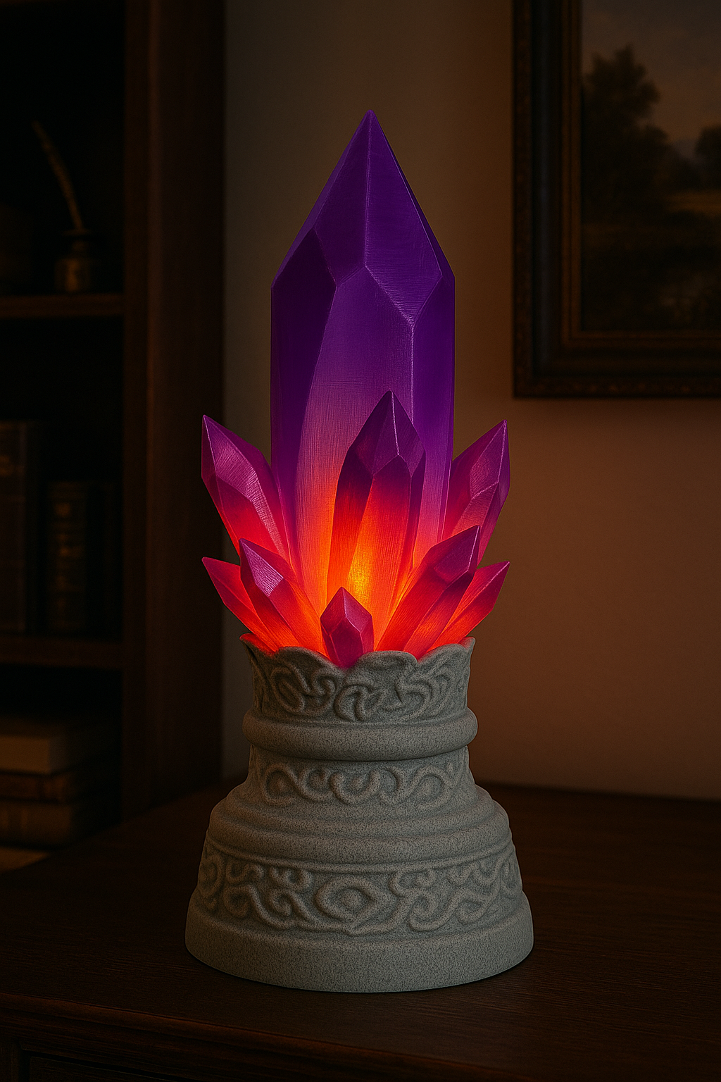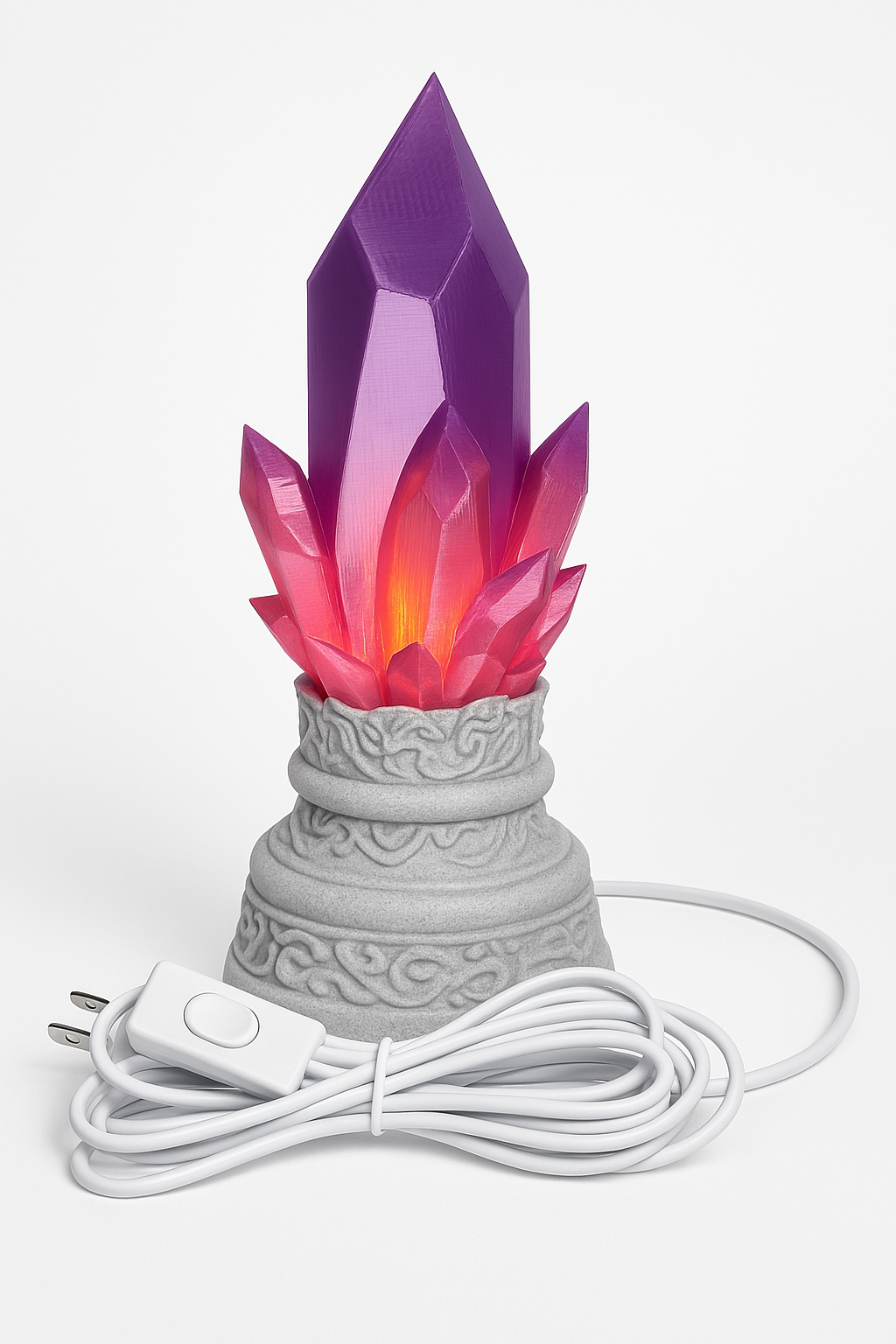 • Twilight Heart Crystal with crafted 3D-printed design — precision PLA construction with stone-textured detailing • Soft LED illumination — energy-efficient warm flame or steady glow options • Vibrant dual tones — shifting from amethyst purple to ember-rose pink • Perfect decor centerpiece — ideal for desks, mantles, and bedside ambiance • Powered by corded LED kit — includes inline switch and plug (no assembly required)
