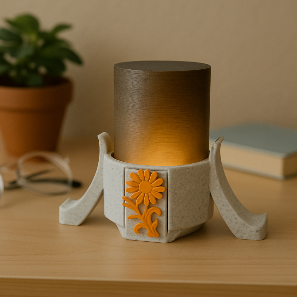 Mystical Candle Holder with charcoal cover, orange flower design, solid marble base, and glowing LED light