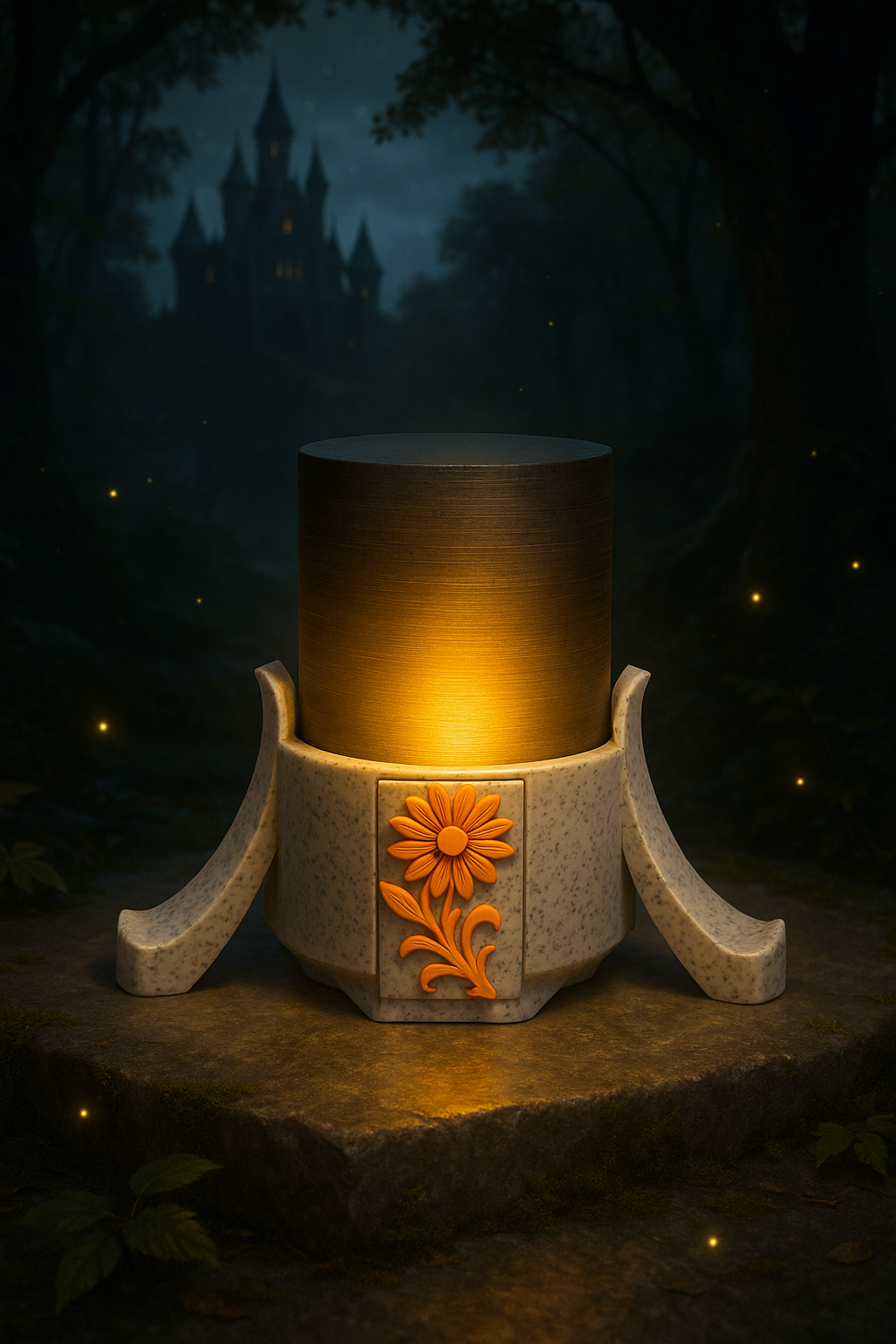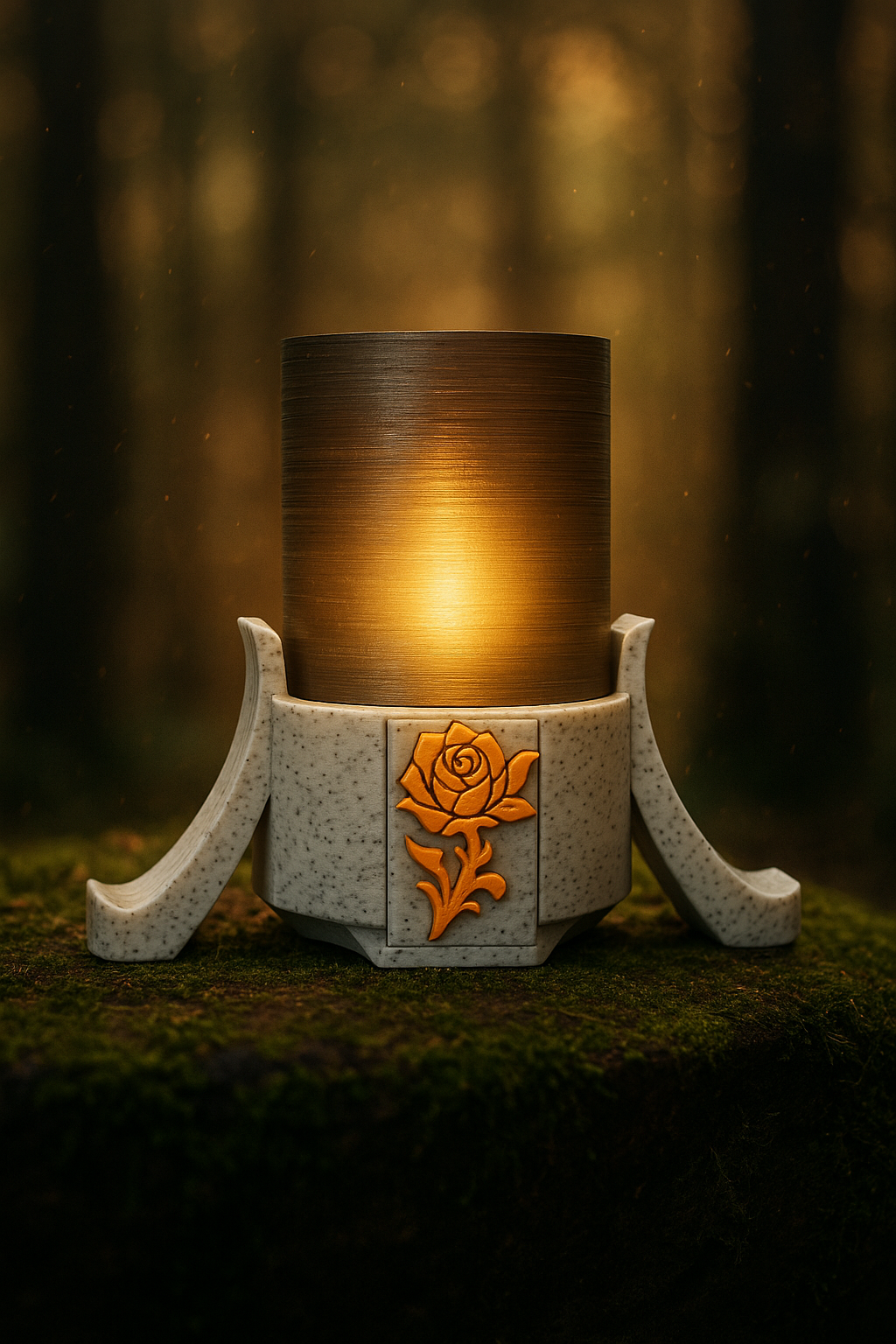 Mystical Candle Holder with charcoal cover and orange flower on solid marble base glowing warmly outdoors