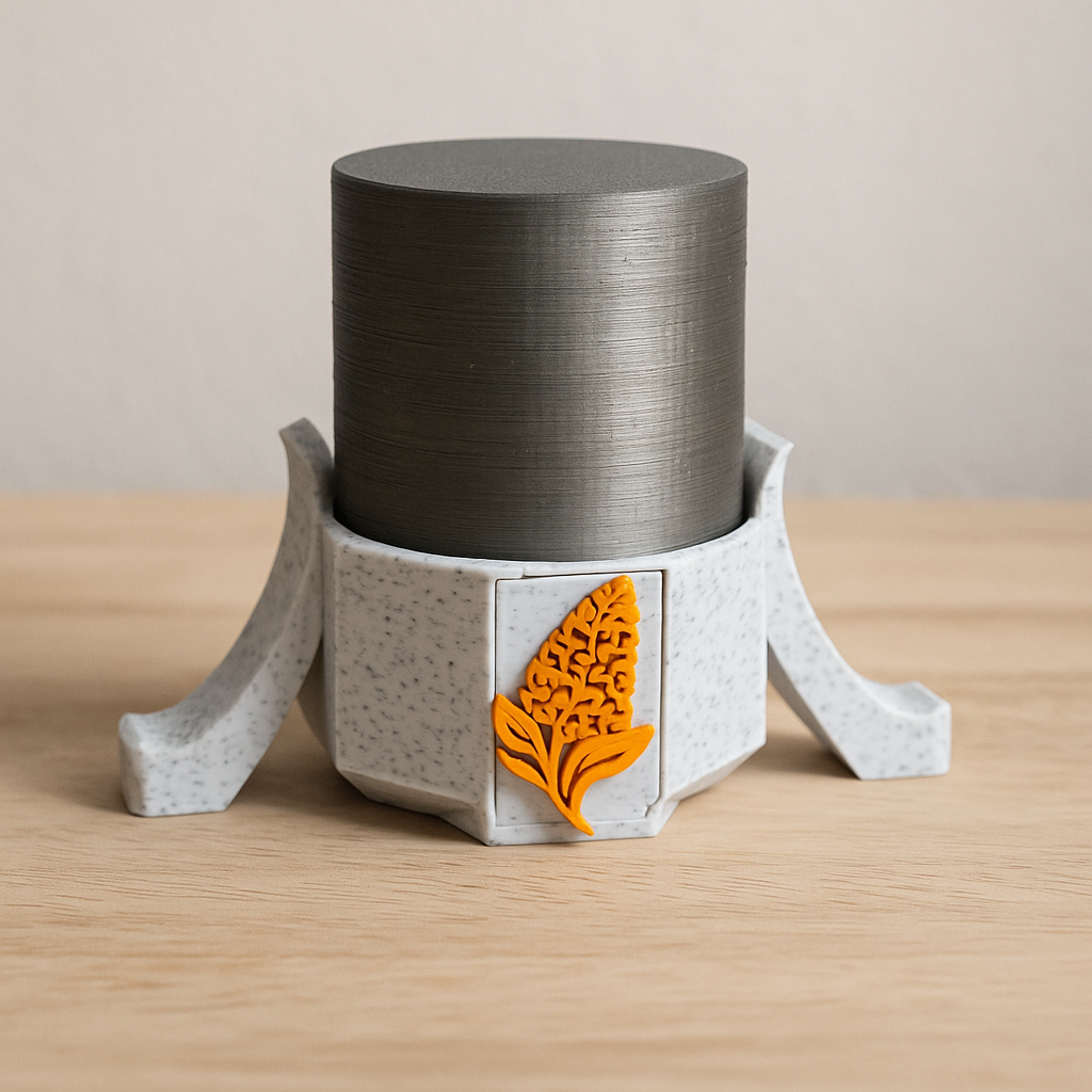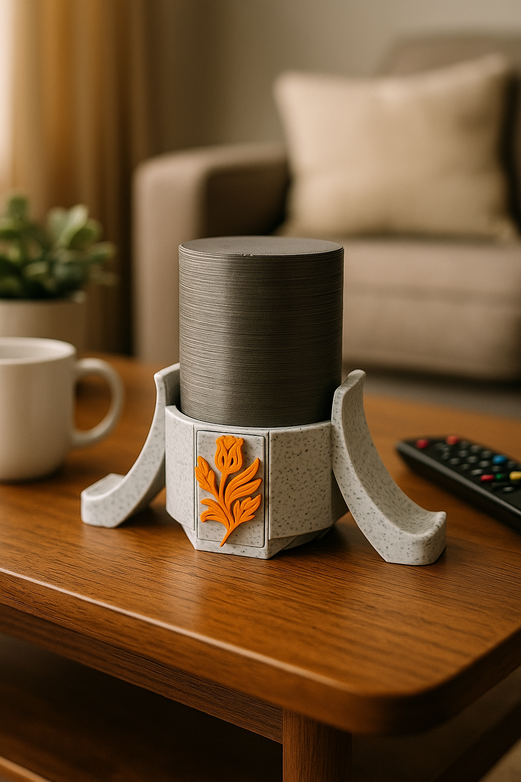 Mystical Candle Holder with charcoal cover, orange floral design, and marble base on wooden table.