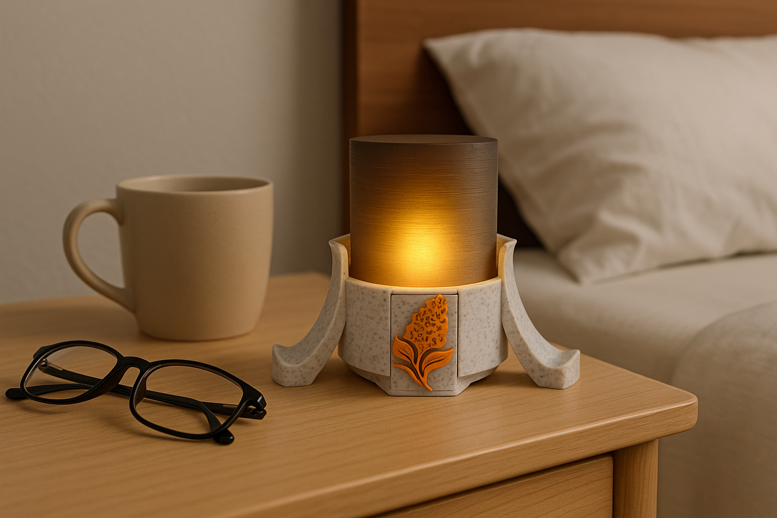 Mystical Candle Holder with charcoal cover and orange flower on marble base glowing on bedside table