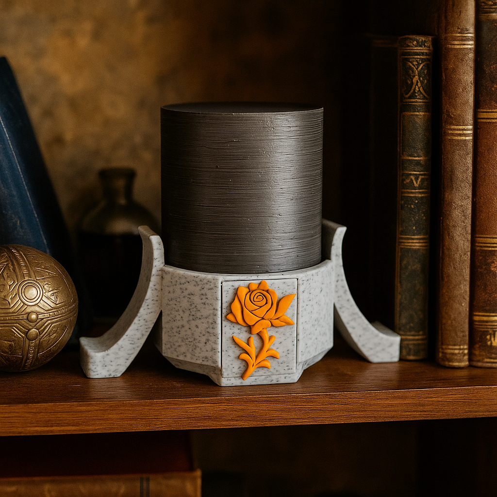 Mystical Candle Holder with charcoal cover and orange flower on marble base displayed on wooden shelf with vintage books and decorative orb