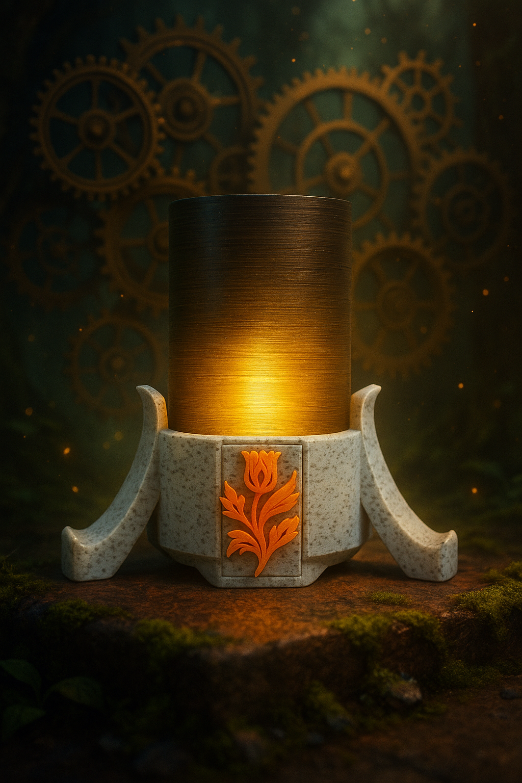 Mystical Candle Holder with charcoal cover, orange flower detail, and marble base glowing warmly on wooden surface